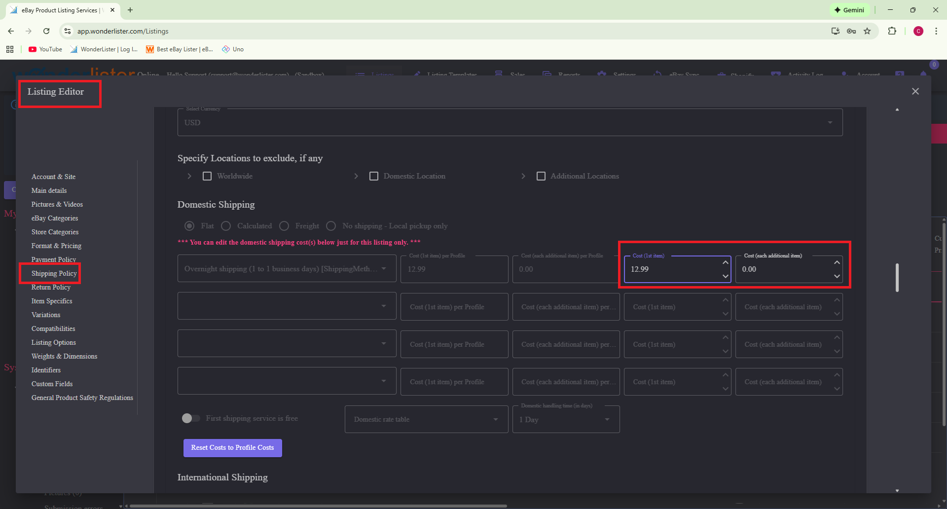In Wonder Lister version 01.03.0146, a new feature was added that allows you to remove shipping cost overrides from eBay listings and you can do that in bulk. If using WonderLister version up to 3.x: If using WonderLister version 5.x or WonderLister Online: