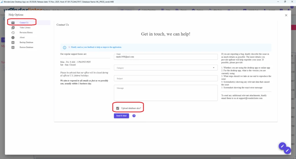 - Click on the option “Send Database to Customer Support“