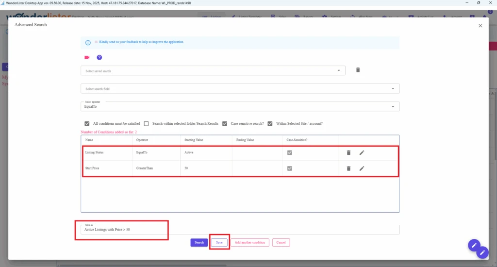 In WonderLister desktop app version 5+ or online app, you can save Advance Search conditions. Once saved, those searches are available to you from the dropdown in the Advance Search dialog, the previously saved search conditions will be pre-populated. You can edit the search conditions before executing the search.